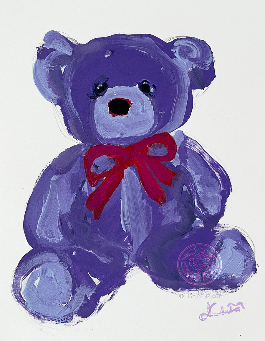 Periwinkle-lavender teddy bear—don't forget the red ribbon! XO, Lisa